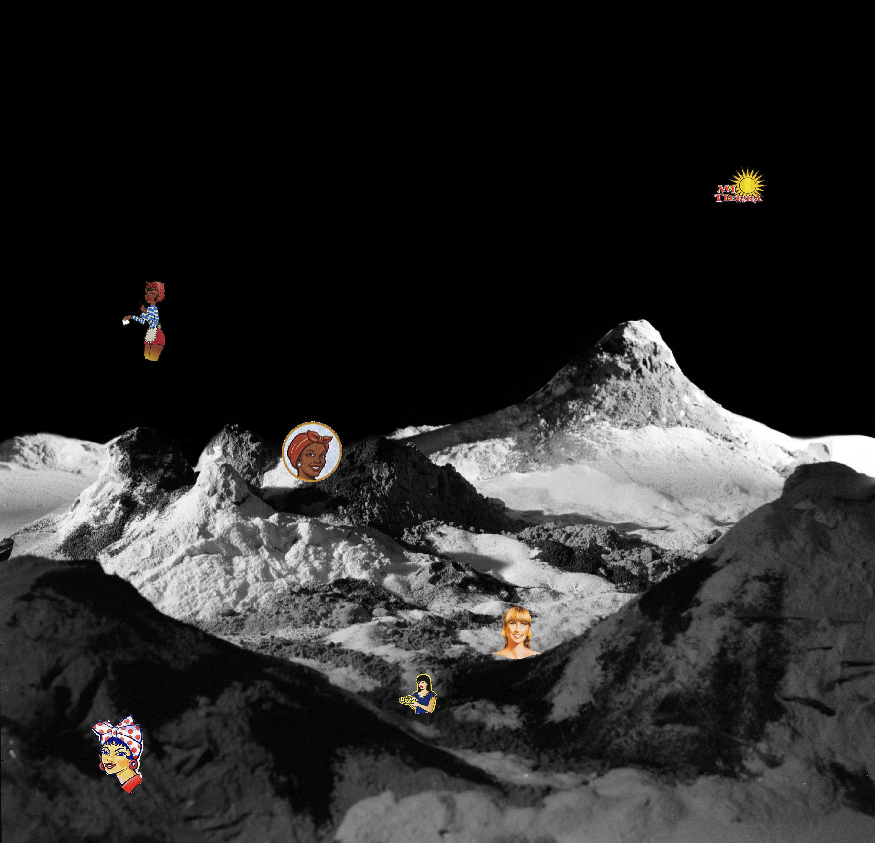 Collaged product mascots—often feminised and sourced from the materials used—examine the relationship between commercial iconography and their historical legacies.